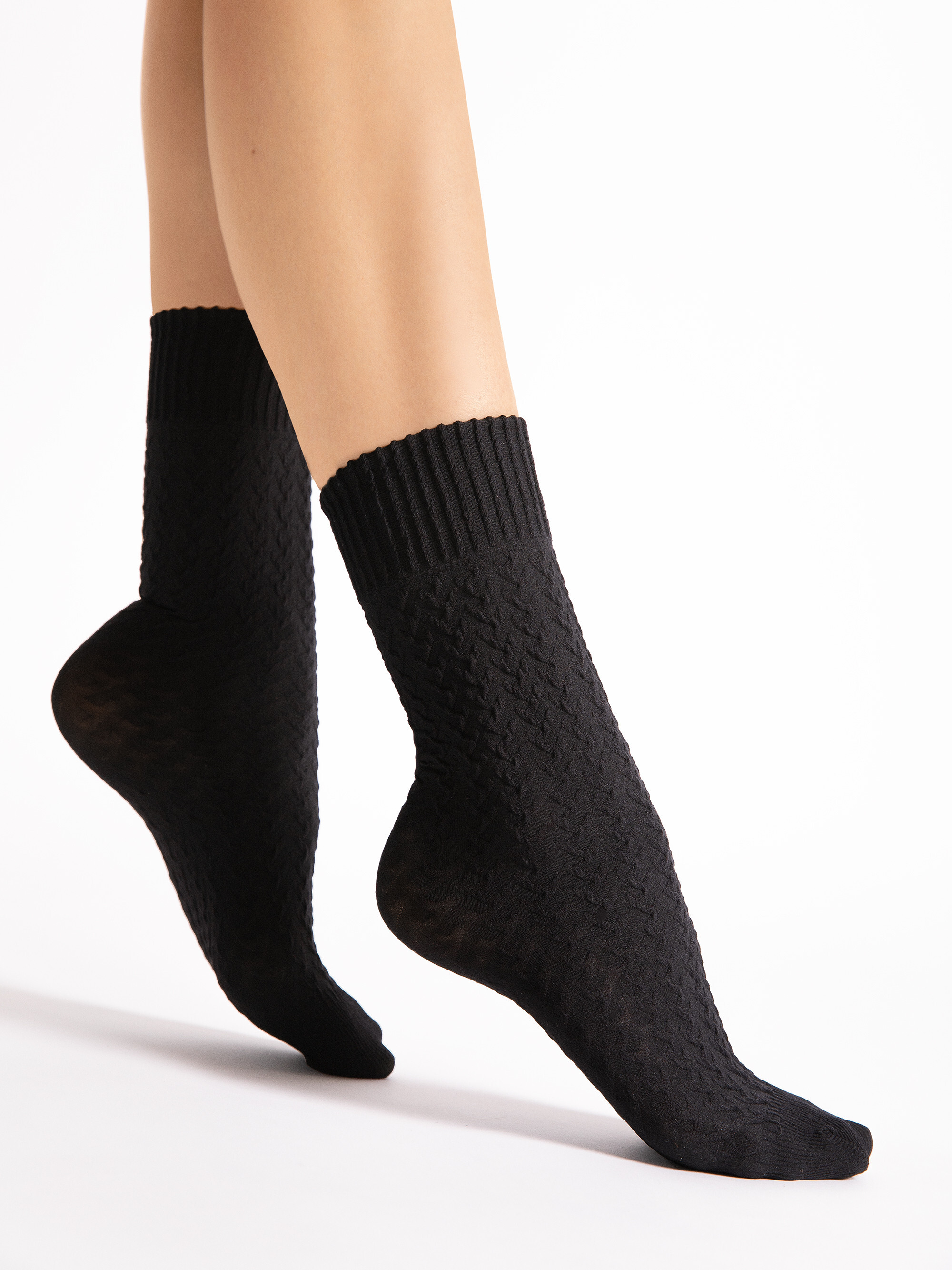 60 denier cable pattern ankle socks with comfortable top and reinforced toes.