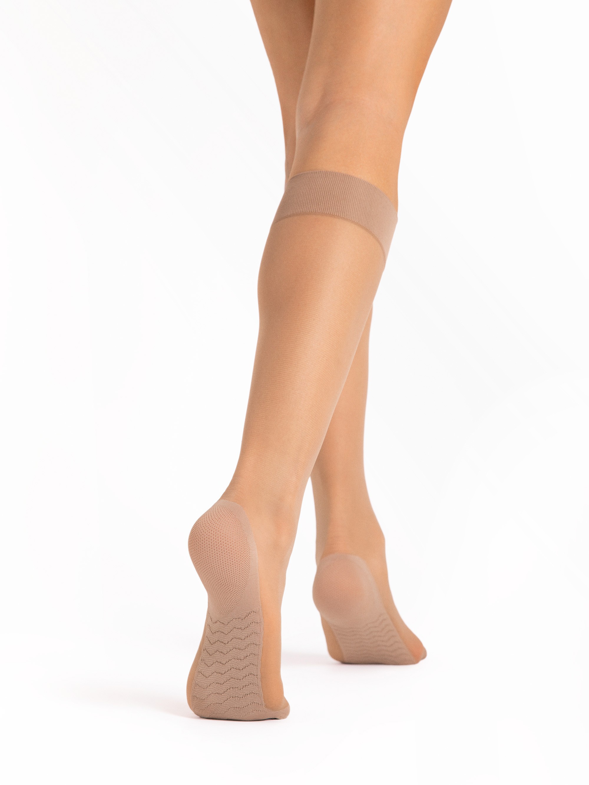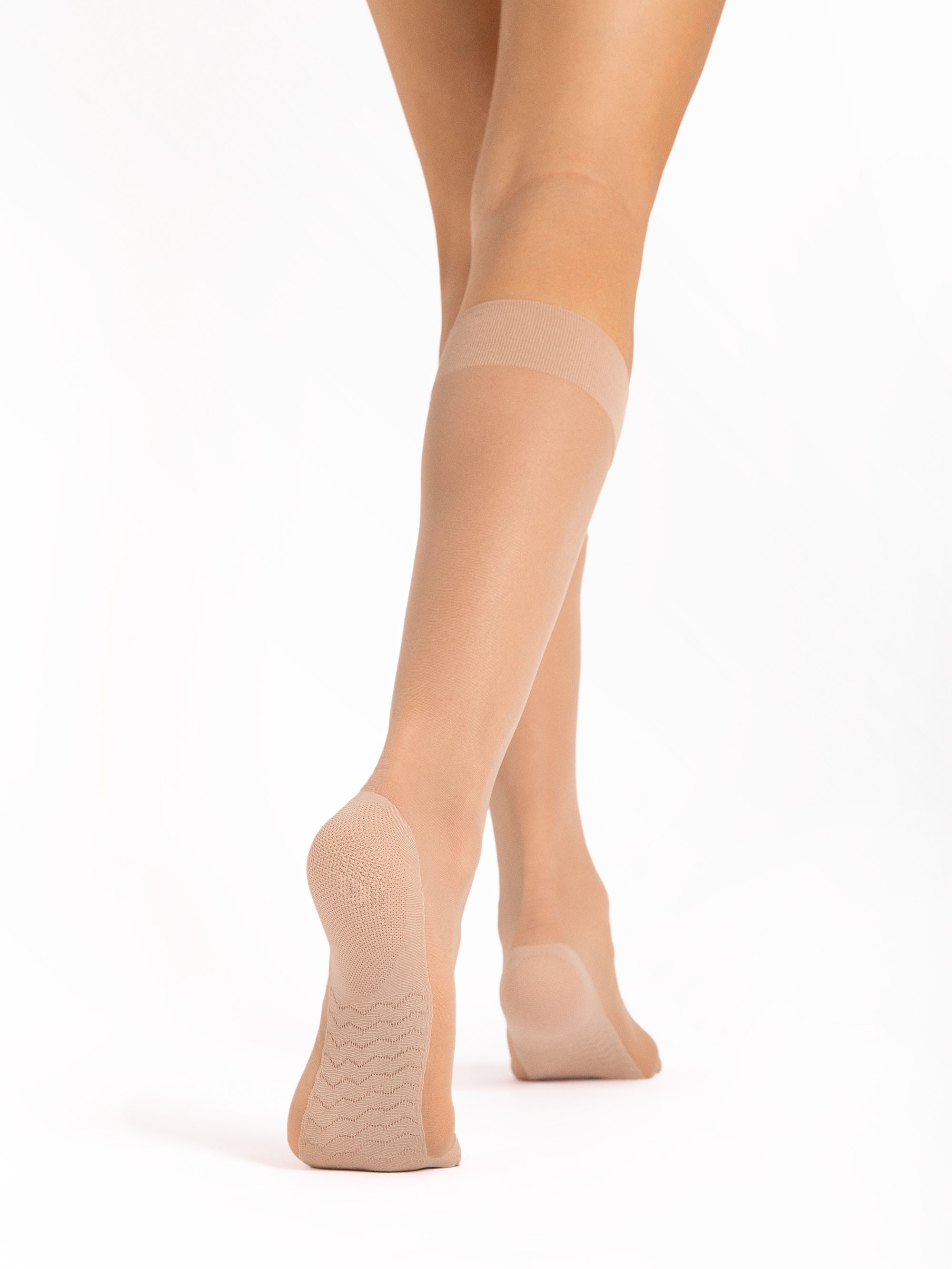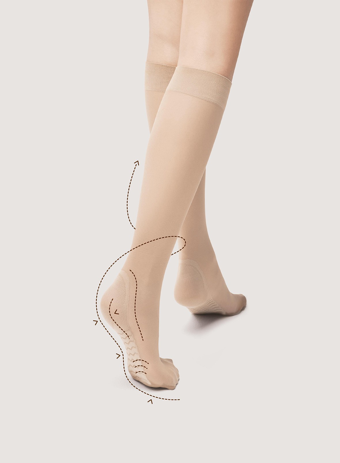 20 denier knee highs with a prophylactic foot-massage effect and a non-pressure band. As a result of Silver Fresh Technology application, woman's skin stays fresh and dry, and the problem of bacterial and fungal growth is kept under control.