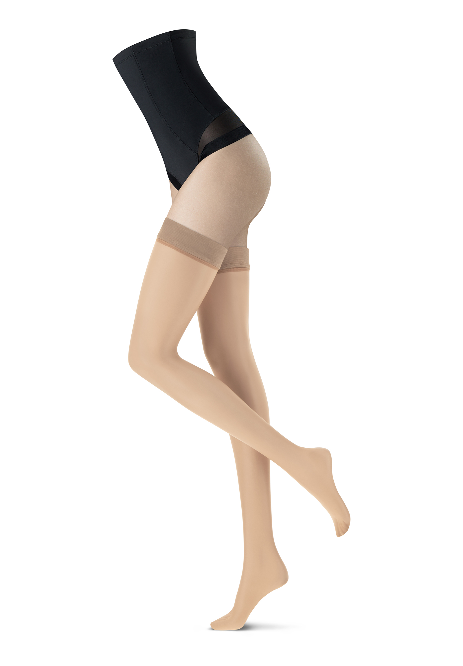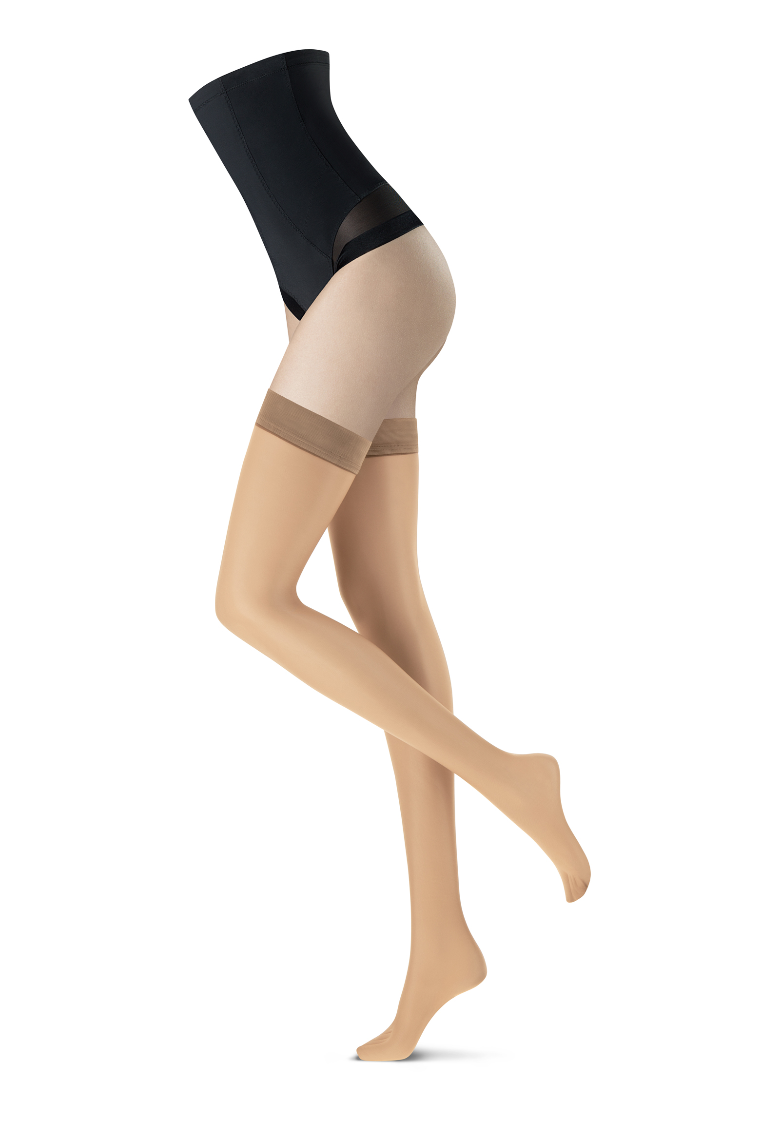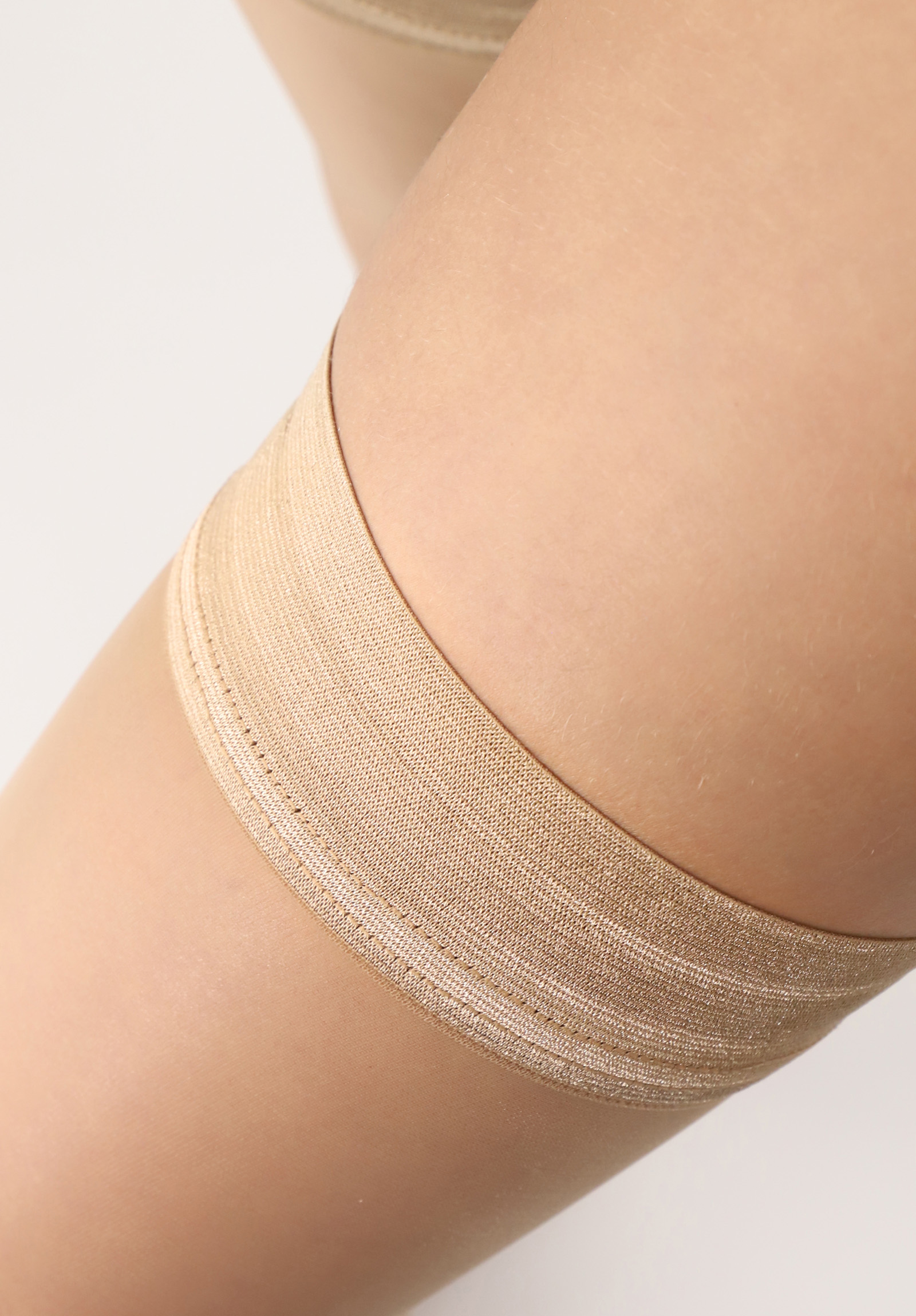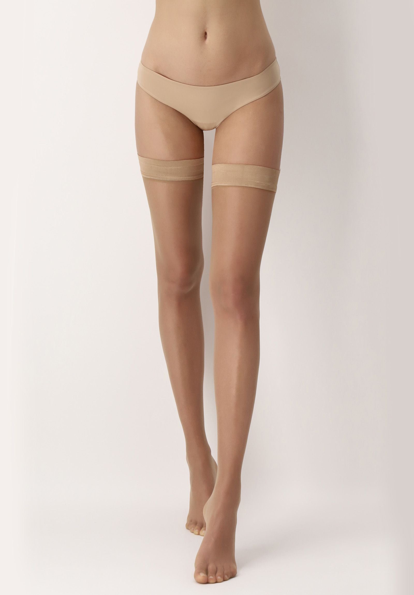 Summer hold ups with a matte, powdery finish that remain invisible thanks to their 8 denier construction. The 5 cm wide top band, with its elegant satin look, is smooth and totally invisible under the most close-fitting outfits. Two silicone strips on the inside ensure a perfect fit. The toes are transparent, making them ideal for open shoes. These hold-ups are perfect for anyone looking for a great alternative to summer tights. Proper care is essential with these hold ups, as the silicone must be kept clean to maintain a good fit. Creams and powders can reduce the grip. Women with particularly slender thighs don't have to forgo these hold-ups; they can also be worn with a garter belt.